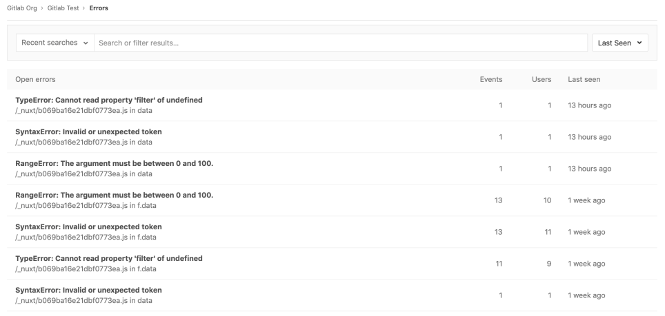 Users with at least Reporter permissions can find the Error Tracking list at Monitor > Error Tracking in your project's sidebar. Here, you can filter errors by title or by status (one of Ignored , Resolved, or Unresolved) and sort in descending order by Frequency, First Seen, or Last Seen. By default, the error list is ordered by Last Seen and filtered to Unresolved errors.