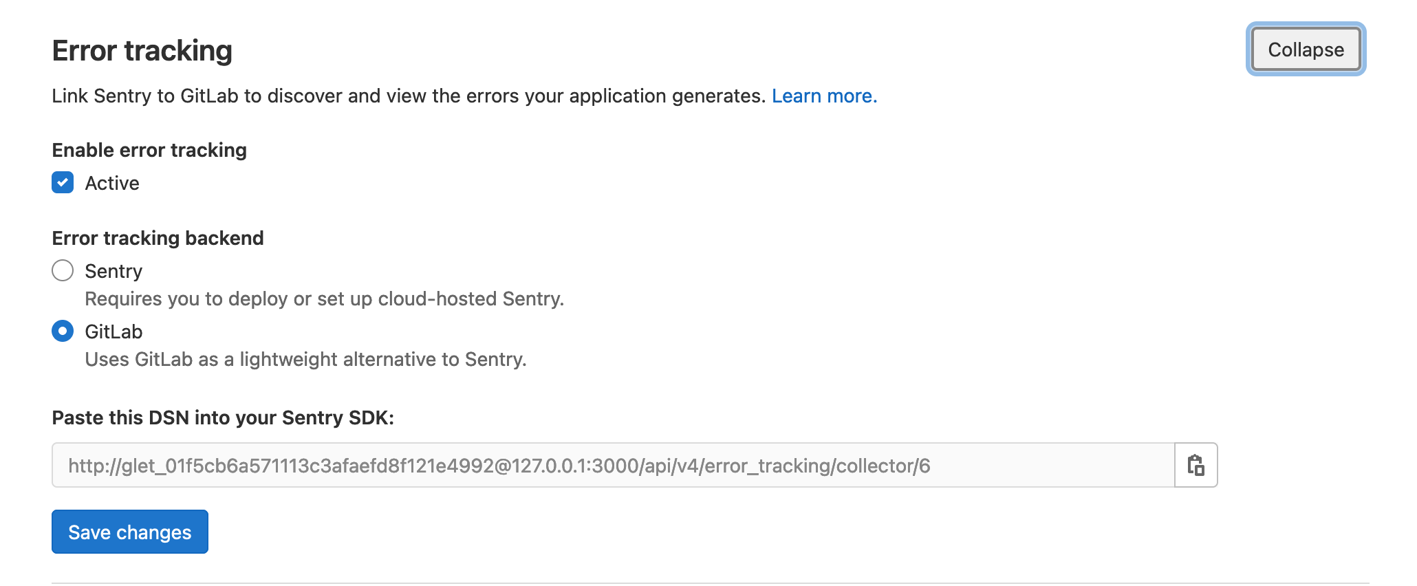 Take the DSN from the previous step and configure your Sentry SDK with it. Errors are now reported to the GitLab collector and are visible in the GitLab UI.