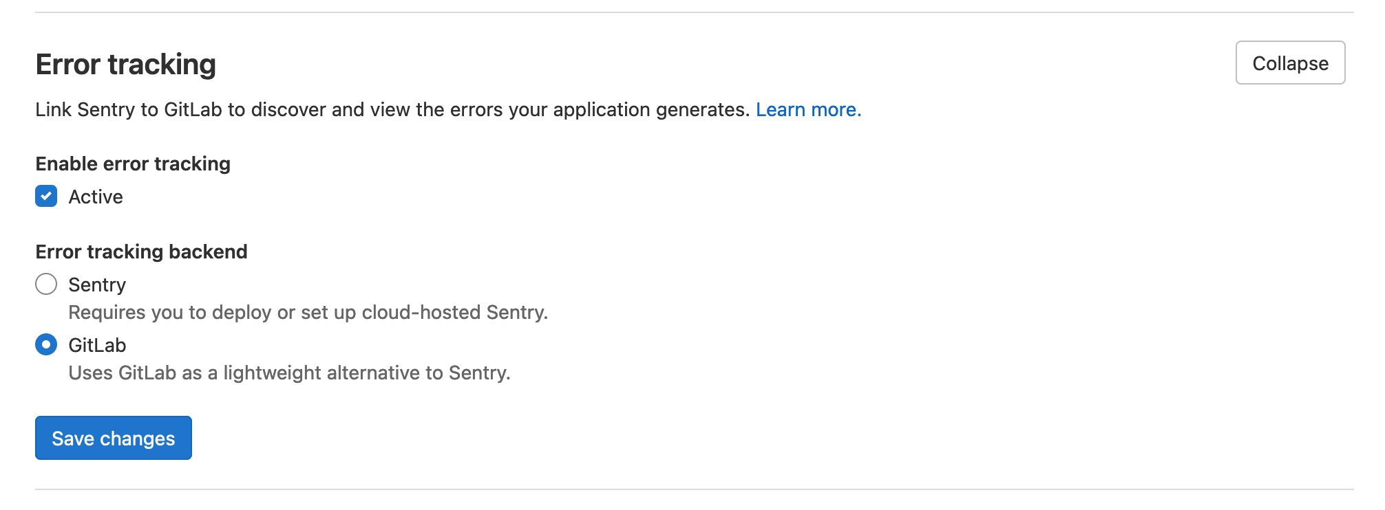 Error tracking backend: the backend can be either GitLab itself or Sentry. When it's GitLab, we name it integrated error tracking because you don't need to set up a separate backend. It's already part of the product.