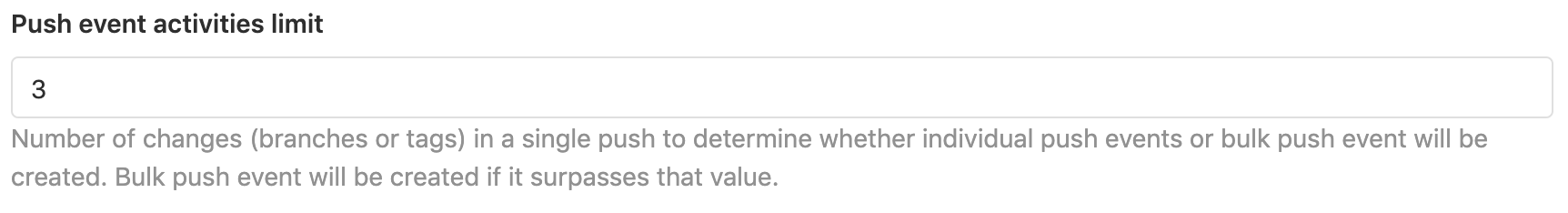 Set the number of branches or tags to limit the number of single push events allowed at once. If the number of events is greater than this, GitLab creates bulk push event instead.