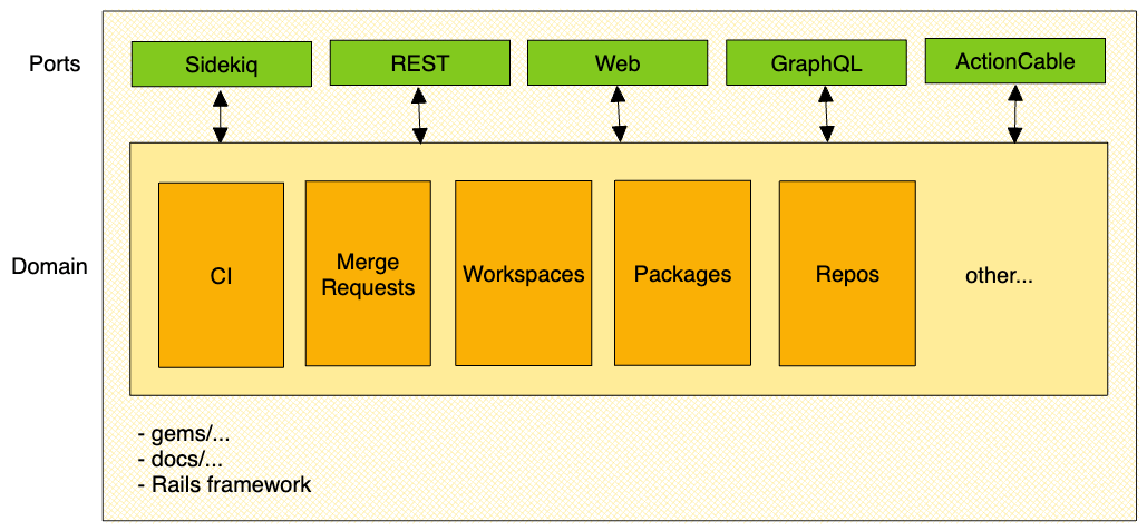 This design document supersedes the previous Composable GitLab Codebase where we explored the idea of separating the codebase into technical runtime profiles: for example, run the monolith solely as a Sidekiq node. With a modular monolith and the use of an Hexagonal Architecture, we can achieve both separation of domains as well as separation of application adapters, which may include the usage of engines and/or different runtime profiles.
