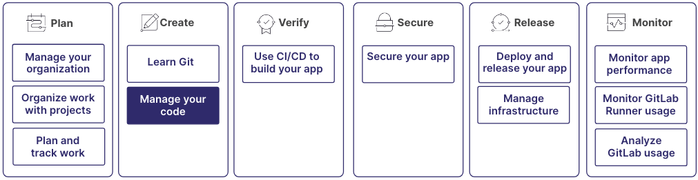 Learn more about creating and managing code in GitLab. The process includes authoring your code, having it reviewed, committing it with version control, and updating it over time.