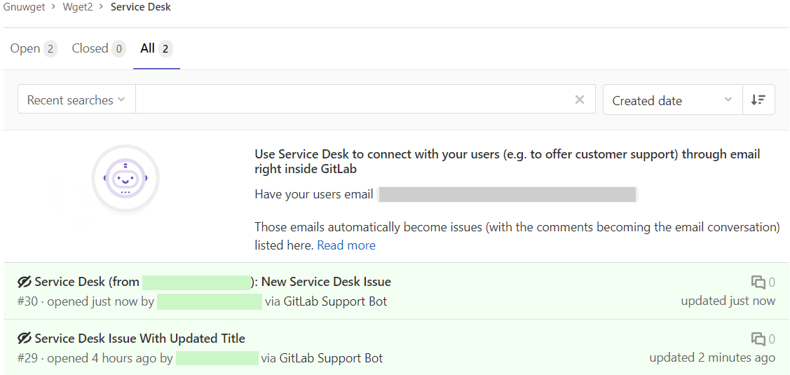 Service Desk issues are confidential, so they are only visible to project members. The project owner can make an issue public. When a Service Desk issue becomes public, the issue creator's and participants' email addresses are visible to signed-in users with at least the Reporter role for the project.